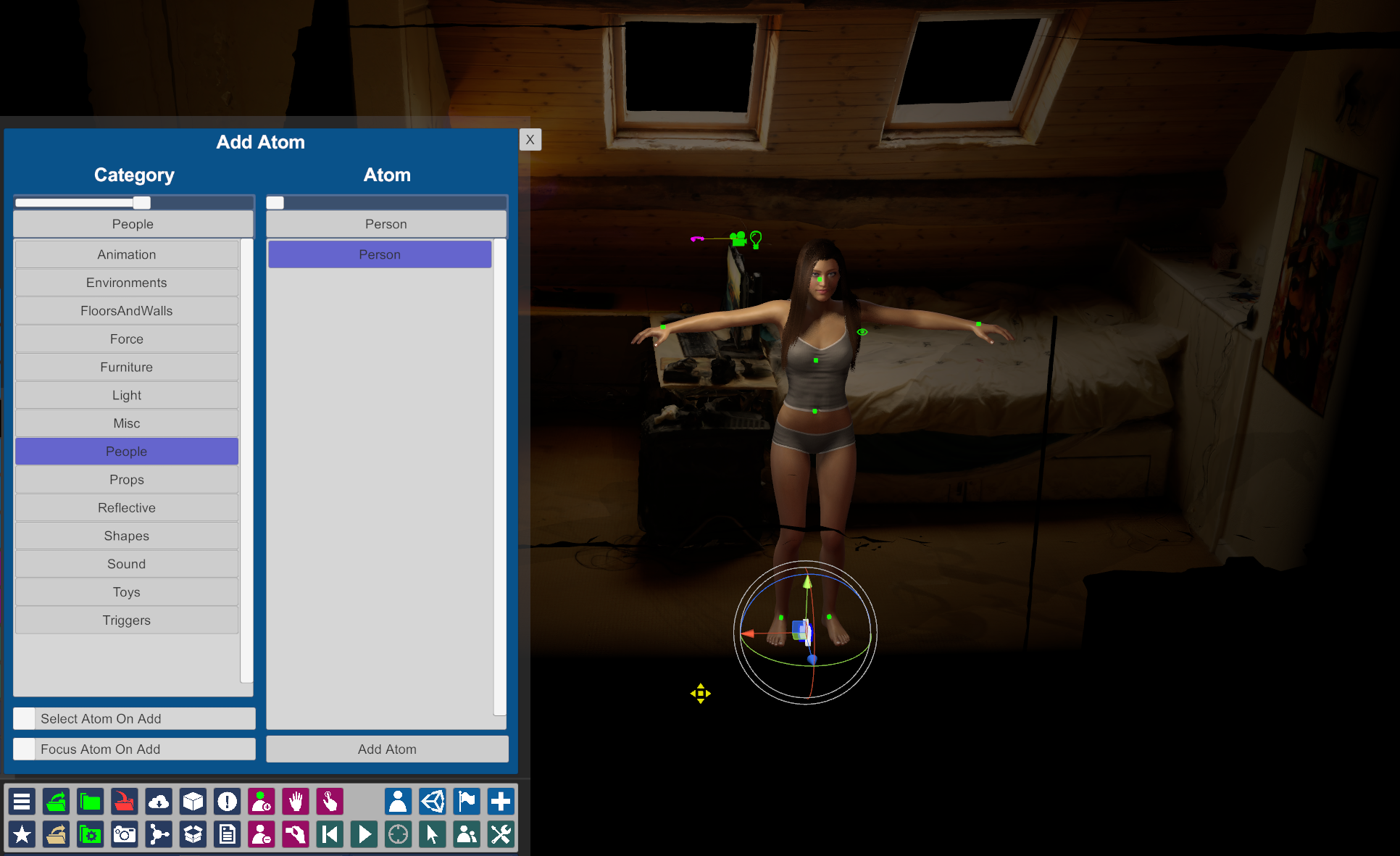 캐릭터를 추가해서 확인을 해본다. 캐릭터 추가하는 방법은 메뉴에서 사람 모양의 아이콘을 누르면 People 카테고리와 오른쪽 원자(Atom)이 기본으로 설정되게 되는데 Add Atom만 눌러주면 추가된다. 오래전의 버전에서는 없었는데 단축버튼이 생겨서 상당히 편하다.