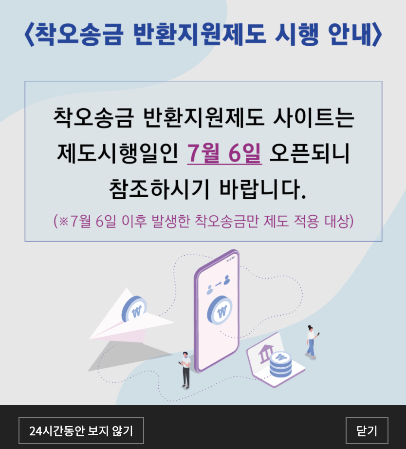 현재는 착오송금 반환지원에 대해 사이트를 준비하고 있는 것으로 보이며 7월 6일부터 사이트가 오픈되어 착오송금 반환에 대해 지원을 한다고 나와있다.