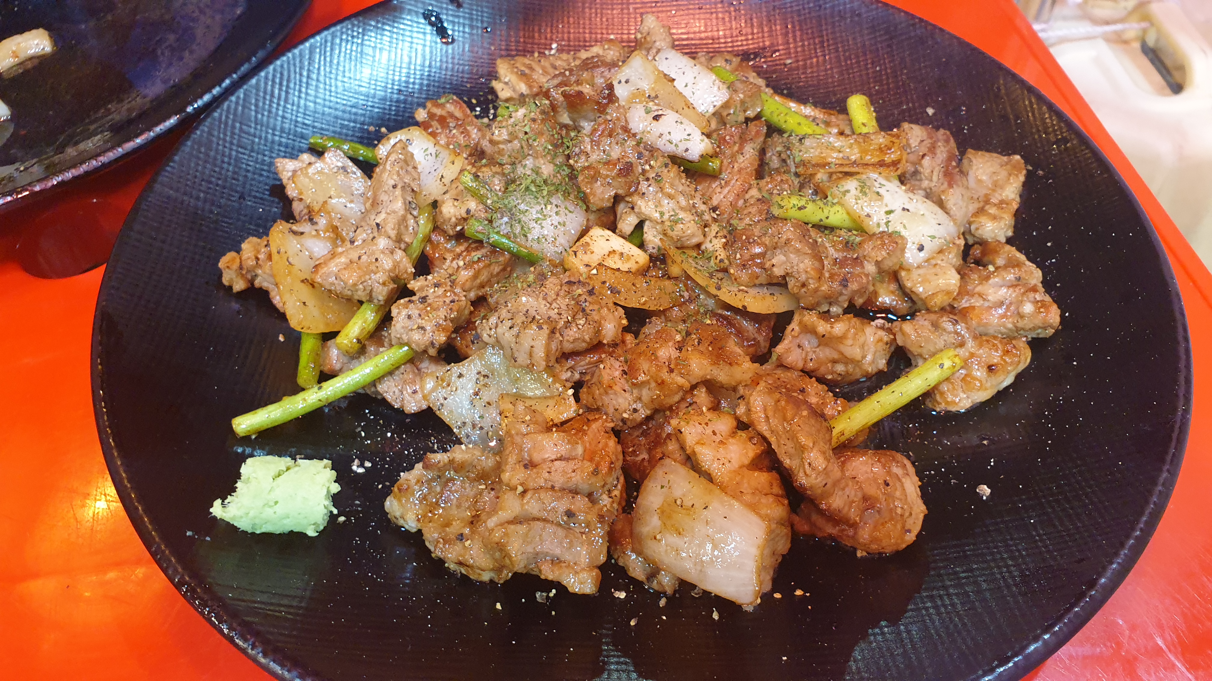 구워서 가져다준다는 것에 대해 반신반의하였는데 어느 정도 굽고 양파나 다른 재료와 향신료를 살짝 넣고 볶아서 가져다줍니다. 떡하니 앉아서 맛있게 즐기기만 하면 됩니다. 다른 매장은 어떤지 모르겠는데 아무래도 지나가면서 본 결과 다른 곳은 일반적인 테이블이 있고 식당의 크기가 큰 반면 이곳은 테이블이 작고 고기를 굽는 도구들이 테이블 위에 존재하지 않기 때문에 구워서 가져다주는 것 같습니다. 즉 다른 곳에서는 직접 구워 먹는다는 것이 될 테죠.